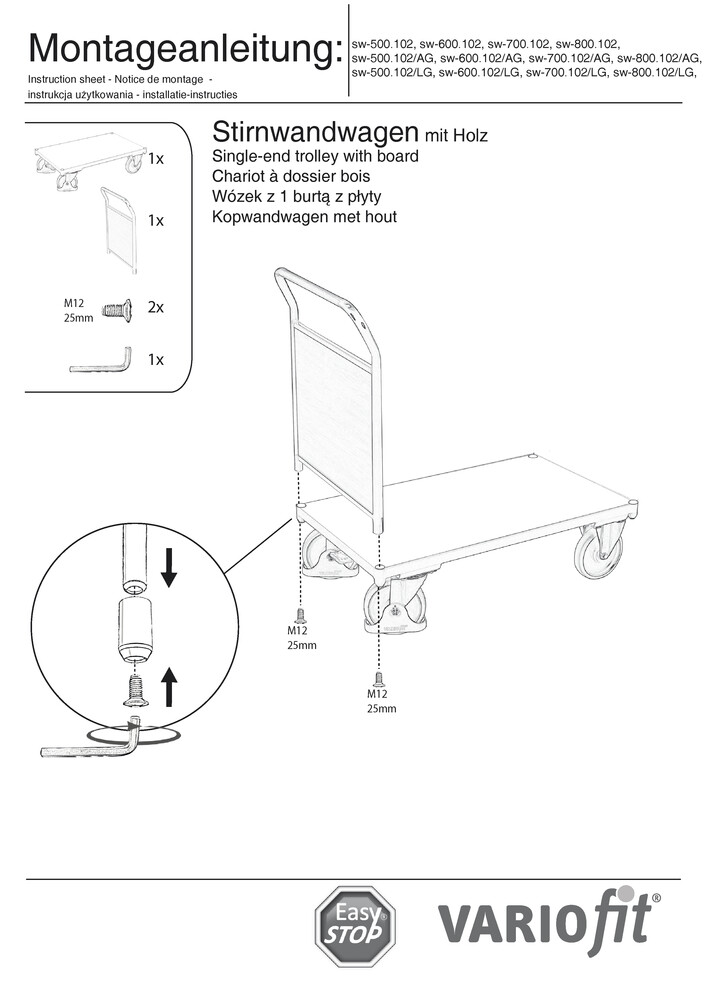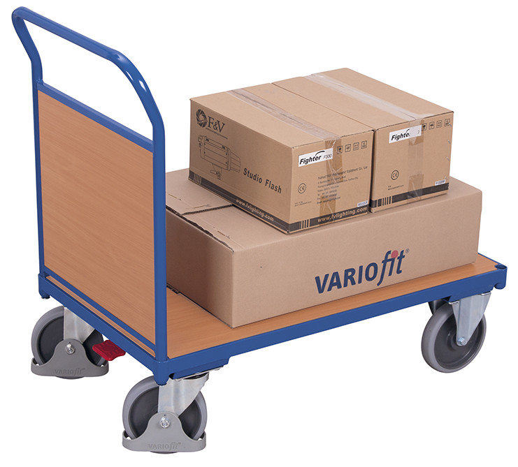 Baukasten-System; Bodenkonstruktion mit dem innovativen L-Profil; Ladefläche und Stirnwand aus Holzwerkstoffplatte; Oberfläche Buchendekor; Wagen pulverbeschichtet RAL 5010 enzianblau; dauerhaft oberflächengeschützt; schlag- und kratzfest; Bereifung aus thermoplastischem Gummi auf Kunststofffelge mit Präzisions-Rillenkugellager, grau, "spurlos"; Faden- und Fußschutz; 2 Lenkrollen mit EasySTOP und 2 Bockrollen.