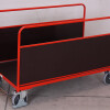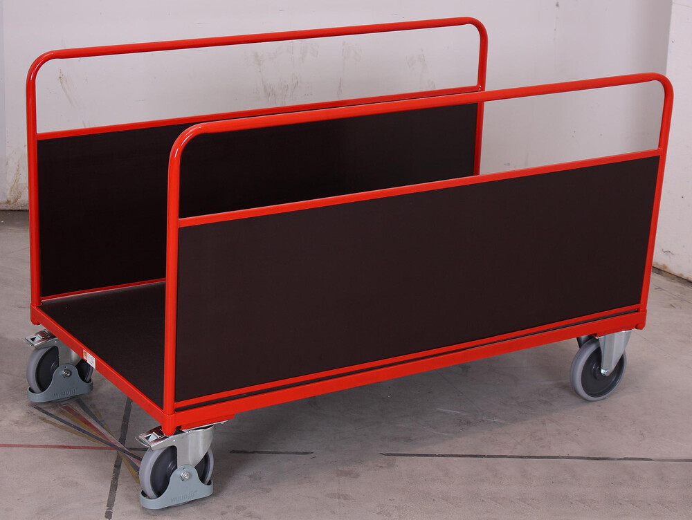 Baukasten-System, Bodenkonstruktion mit dem innovativen L-Profil; Ladefläche und Längswände aus Holzwerkstoffplatte, Oberfläche Buchendekor; Wagen pulverbeschichtet RAL 5010 enzianblau; dauerhaft oberflächengeschützt; schlag- und kratzfest; Bereifung aus thermoplastischem Gummi auf Kunststofffelge mit Präzisions-Rillenkugellager, grau, "spurlos"; Faden- und Fußschutz; 2 Lenk- und 2 Bockrollen; mit Zentralbremse EasySTOP (längsseitig je 1 Lenk- und Bockrolle gebremst).
