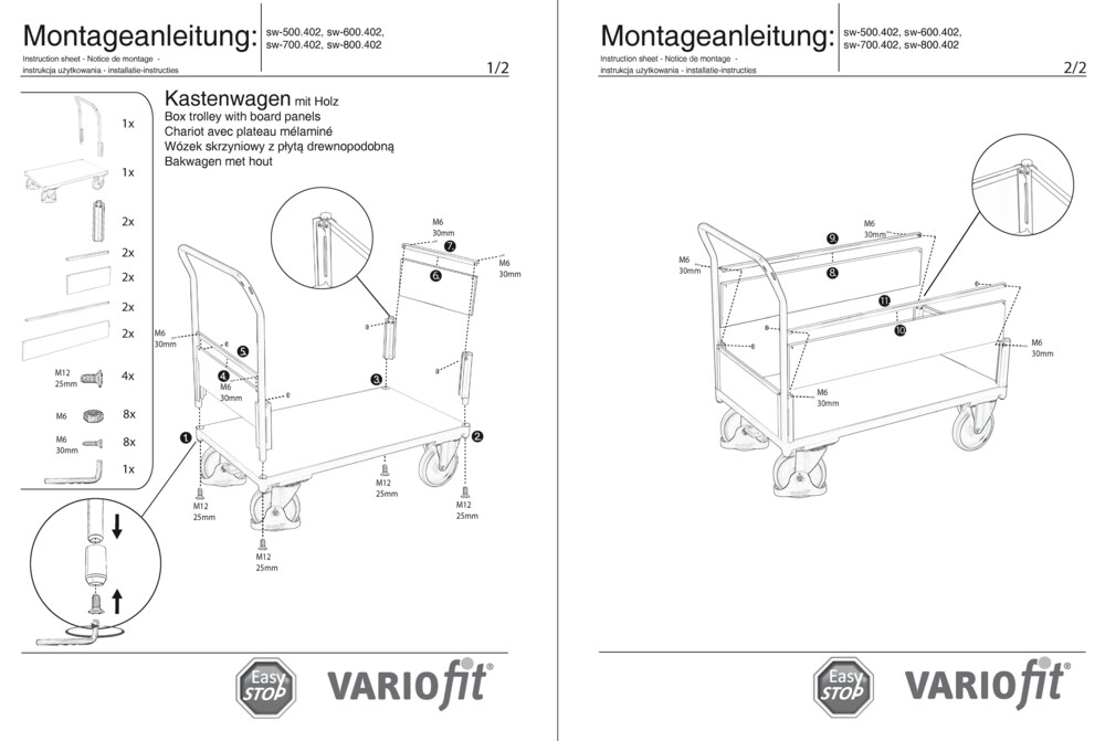 Baukasten-System; Bodenkonstruktion mit dem innovativen L-Profil; Ladefläche aus Holzwerkstoffplatte; Oberfläche Buchendekor; Stirn- und Längswände aus Holzwerkstoffplatte; Oberfläche Buchendekor; Stirn- und Längswandhöhe: 200 mm; Stirn- und Längswände einzeln herausnehmbar; Wagen pulverbeschichtet RAL 5010 enzianblau; dauerhaft oberflächengeschützt; schlag- und kratzfest; Bereifung aus thermoplastischem Gummi auf Kunststofffelge mit Präzisions-Rillenkugellager, grau, "spurlos"; Faden- und Fußschutz; 2 Lenkrollen mit EasySTOP und 2 Bockrollen.