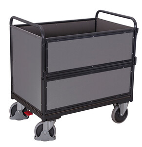Baukasten-System; Bodenkonstruktion mit dem innovativen L-Profil; Ladefläche, Stirn- und Längswände aus Holzwerkstoffplatte, Oberfläche Buchendekor; Stirn- und Längswandhöhe: 710 mm; eine Längswand halb abklappbar; Wagen pulverbeschichtet RAL 5010 enzianblau; dauerhaft oberflächengeschützt; schlag- und kratzfest; Bereifung aus thermoplastischem Gummi auf Kunststofffelge mit Präzisions-Rillenkugellager, grau, "spurlos"; Faden- und Fußschutz; 2 Lenkrollen mit EasySTOP und 2 Bockrollen.