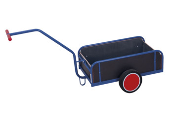 Welded steel construction; Railing 220 mm high; With reflective films; Screwed hand drawbar with plastic handles and stand; Load surface of waterproof bonded plywood, surface finish screen printed, anti-slip; Truck powder-coated RAL 5010 gentian blue; Permanent surface protection; Impact- and scratch-resistant; Pneumatic tyres on steel wheel rim with precision deepgroove ball bearings.