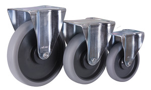 Grey non-marking thermoplastic rubber tyres on plastic wheel rim with precision deepgroove ball bearings; Thread guard; High carrying capacity; Low noise; Low rolling resistance; High wear-resistance; Resistant to chemicals (oils, gases, acids, solvents and organic subastances); Temperature-resitant -20°/+80°C; 65° Shore A.