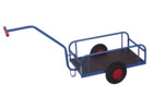 Construction très robuste, solidement mécano-soudée en tube d'acier; hauteur de parois 220 mm; réflecteurs de sécurité; timon manuel vissé, avec poignée en plastique, avec pied; plateau en contreplaqué hydrofuge et antidérapant; revêtement époxy bleu RAL 5010; résistant aux chocs et aux rayures; roues à bandage pneumatique sur jantes en tôle d’acier avec roulement à billes de précision.