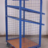 Construction mécano-soudé en tube d'acier; vissée; inclinaison des étagères 17° ou 32° réglable à l'aide des vis; étagères sans plateau; rebord de 27 mm; claire-voie entre tuyaux horizontaux sur les côtés: 125 mm; l'écart des trous pour visser des étagères: 150 mm; convenables pour bacs plastiques 600 x 400 mm (L/P); revêtement époxy bleu RAL 5010, résistant aux chocs et aux rayures; roues à bandage en caoutchouc thermoplastique gris anti-trace avec jante en plastique et roulement à billes de précision, protège-pieds et protection contre fibre, 4 roulettes pivotantes avec protège-pieds, dont 2 avec frein.