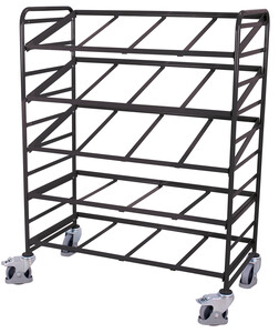 Construction mécano-soudé en tube d'acier; vissée; inclinaison des étagères 17° ou 32° réglable à l'aide des vis; étagères sans plateau; rebord de 27 mm; claire-voie entre tuyaux horizontaux sur les côtés: 125 mm; l'écart des trous pour visser des étagères: 150 mm; convenables pour bacs plastiques 600 x 400 mm (L/P); revêtement époxy bleu RAL 5010, résistant aux chocs et aux rayures; roues à bandage en caoutchouc thermoplastique gris anti-trace avec jante en plastique et roulement à billes de précision, protège-pieds et protection contre fibre, 4 roulettes pivotantes avec protège-pieds, dont 2 avec frein.