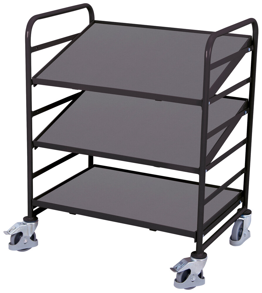 Construction mécano-soudé en tube d'acier; vissée; inclinaison des étagères 17° ou 32° réglable à l'aide des vis; étagères avec plateau en mélaminé; décor hêtre; rebord de 15 mm; claire-voie entre tuyaux horizontaux sur les côtés: 125 mm; l'écart des trous pour visser des étagères: 150 mm; convenables pour bacs plastiques 600 x 400 mm (L/P); revêtement époxy bleu RAL 5010, résistant aux chocs et aux rayures; roues à bandage en caoutchouc thermoplastique gris anti-trace avec jante en plastique avec roulement à billes de précision, protège-pieds et protection contre fibre, 4 roulettes pivotantes avec protège-pieds, dont 2 avec frein.