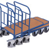 Construction mécano-soudé en tube d'acier; possibilité d'insérer l´un dans l'autre; plateau mélaminé décor hêtre; poignée avec tubes verticaux; revêtement époxy bleu RAL 5010; résistant aux chocs et aux rayures; roues à bandage en caoutchouc thermoplastique gris anti-trace avec jante en plastique avec roulement à billes de précision, protège-pieds et protection contre fibre, 2 roulettes pivotantes avec frein et 2 roulettes fixes.