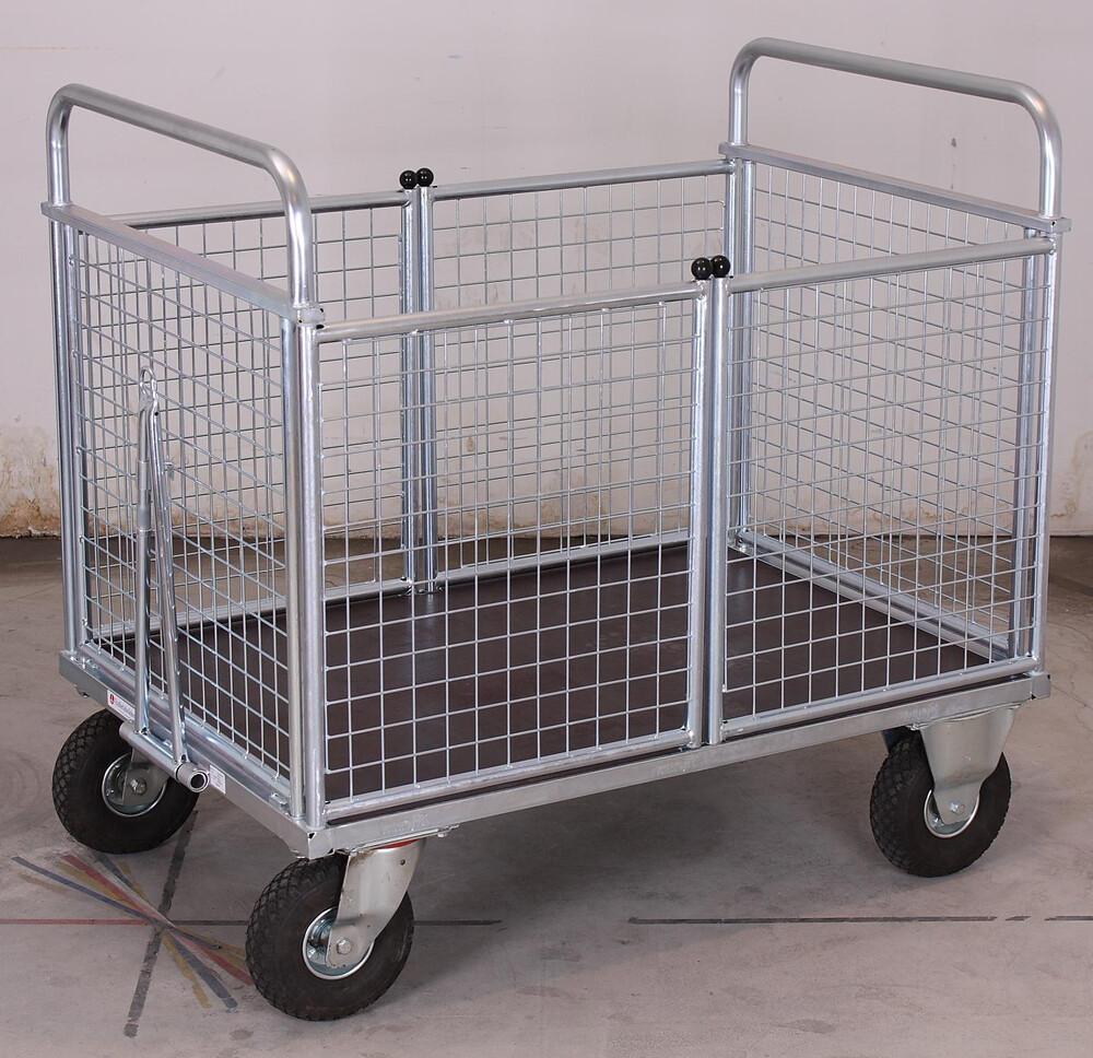 Conception modulaire; châssis mécano-soudé avec profilé L innovant et plateau mélaminé; décor hêtre; parois en avant et parois latérales en grillage métallique, mailles 50 x 50 mm; hauteur des côtés: 200 mm; côté long demi ouvert; revêtement époxy bleu RAL 5010; résistant aux chocs et aux rayures; roues à bandage en caoutchouc thermoplastique gris anti-trace avec jante en plastique et roulement à billes de précision, protège-pieds et protection contre fibre, 2 roulettes pivotantes avec frein EasySTOP et 2 roulettes fixes.