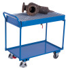 Construction mécano-soudé en tube d'acier; vissée; bac en tôle étanche à l'huile et avec rebord 25 mm; avec bac de rétention vissé (vol. 60 Ltr.), caillebotis galvanisé avec mailles 30 x 30 mm, robinet d'écoulement conique, hauteur des parois 100 mm; revêtement époxy bleu RAL 5010, résistant aux chocs et aux rayures; roues à bandage en caoutchouc thermoplastique gris anti-trace avec jante en plastique et roulement à billes de précision, protège-pieds et protection contre fibre, 2 roulettes pivotantes avec frein EasySTOP et 2 roulettes fixes.