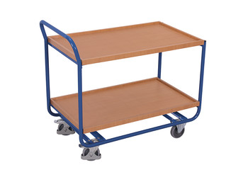 Construction mécano-soudé en tube d'aluminium; plateaux mélaminés; décor hêtre; avec bordure hauteur 17 mm; roues à bandage en caoutchouc thermoplastique gris anti-trace avec jante en plastique avec roulement à billes de précision, protège-pieds et protection contre fibre, 2 roulettes pivotantes avec frein et 2 roulettes fixes.