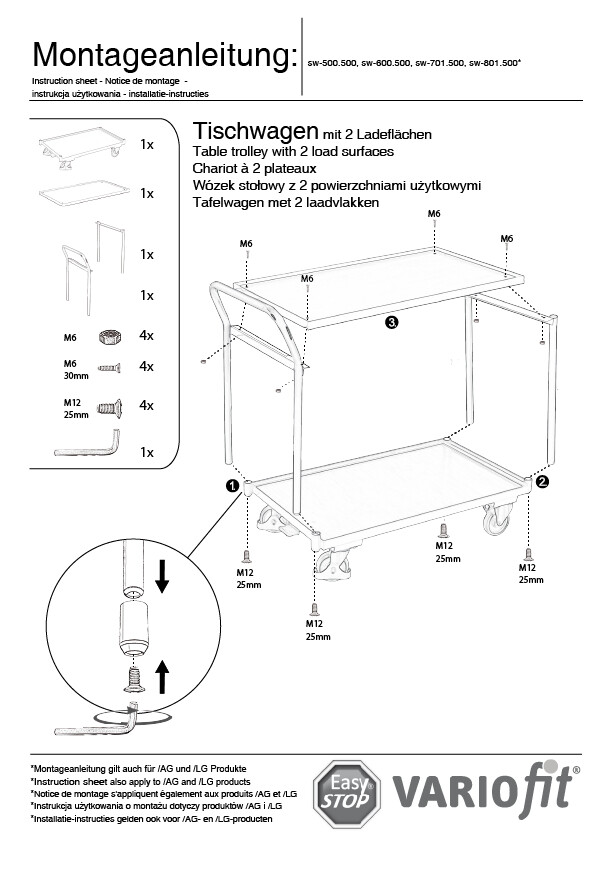 Conception modulaire; châssis mécano-soudé avec profilé L innovant; plateaux mélaminés; décor hêtre; les étagères se trouvent dans le cadre en cornière d'acier; surface utile avec rebord = 15 mm; revêtement époxy bleu RAL 5010; résistant aux chocs et aux rayures; roues à bandage en caoutchouc thermoplastique gris anti-trace avec jante en plastique et roulement à billes de précision, protège-pieds et protection contre fibre, 2 roulettes pivotantes avec frein EasySTOP et 2 roulettes fixes.