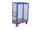 Conception modulaire; avec barre de poussée; châssis mécano-soudé avec profilé L innovant; avec barre de poussée vissée; 2 tubes galvanisé de support aussi vissés; plateau mélaminé; décor hêtre; étagères en option et réglables au pas de 120 mm; parois grillagées; maillage 120 x 120 mm; les côté long accroché, on peut les utiliser de façon interchangeable; revêtement époxy bleu RAL 5010; résistant aux chocs et aux rayures; roues à bandage en caoutchouc thermoplastique gris anti-trace avec jante en plastique et roulement à billes de précision, protège-pieds et protection contre fibre, 2 roulettes pivotantes avec frein EasySTOP et 2 roulettes fixes.