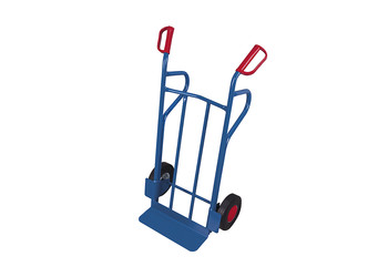 Construction mécano-soudé en tube d'acier; avec 2 poignées de sécurité; pelle en tôle d'acier; avec barres horizontales, legèrement courbées; revêtement époxy bleu RAL 5010; résistant aux chocs et aux rayures; roues à bandage pneumatique sur jantes en tôle d'acier ou roues à bandage en caoutchouc plein sur jantes en plastique spéciale avec roulement à billes de précision et capuchon en plastique; roues de support à bandage en caoutchouc thermoplastique gris anti-trace avec jante en plastique avec roulement à billes de précision, protection contre fibre; 2 roulettes pivotantes; avec ressort à gaz et avec pédale antidérapante sur l'axe.