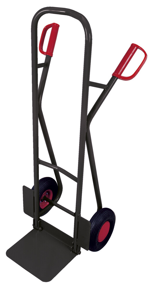 Construction mécano-soudée; avec 2 poignées de sécurité; pelle en tôle d'acier; pelle repliable; avec barres rectilignes ou legèrement courbées; revêtement époxy bleu RAL 5010; résistant aux chocs et aux rayures; roues à bandage pneumatique sur jantes en tôle d'acier ou roues à bandage en caoutchouc plein sur jantes en plastique spéciale avec roulement à billes de précision et capuchon en plastique.