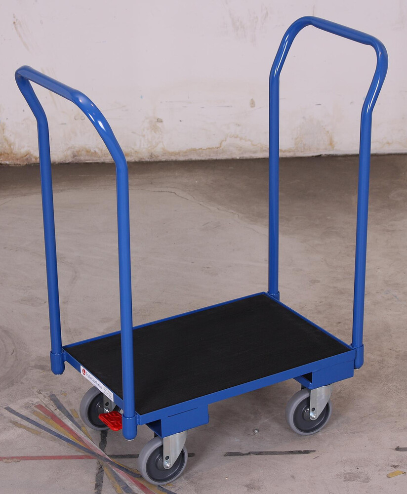 Construction mécano-soudée en cornière d'acier; surface utile avec plateau mélaminé; décor hêtre; avec rebord 10 mm; convenables pour bacs plastiques 600 x 400 mm (L/P); 4 douilles cornières; avec poignée; revêtement époxy bleu RAL 5010; résistant aux chocs et aux rayures; roues à bandage en caoutchouc thermoplastique gris anti-trace avec jante en plastique avec roulement à billes de précision, protège-pieds et protection contre fibre, 4 roulettes pivotantes dont 2 avec frein EasySTOP.