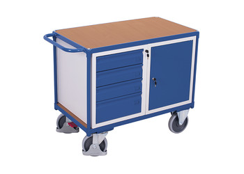 Składana konstrukcja stalowa; konstrukcja podłogi z innowacyjnego profilu stalowego; powierzchnia użytkowa z płyty drewnopodobnej, okleina dekor bukowy; bez krawędzi; przód wózka malowany proszkowo farbą RAL 5010 (niebieski); korpus RAL 7035 (jasno szary); wysoka odporność na uszkodzenia mechaniczne; szuflady na prowadnicach, z zamkiem cylindrycznym; nośność każdej szuflady 25 kg; bieżnik z szarej gumy termoplastycznej, niebrudzący, na feldze z tworzywa; koła z precyzyjnym łożyskiem kulkowym; osłona przeciwwłókienna i osłona stopy; 2 koła obrotowe z EasySTOP i 2 koła stałe.