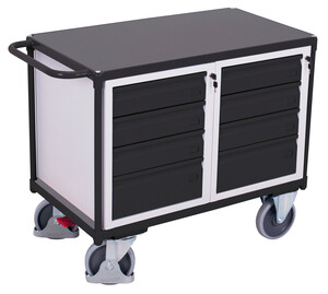 Składana konstrukcja stalowa; konstrukcja podłogi z innowacyjnego profilu stalowego; powierzchnia użytkowa z płyty drewnopodobnej, okleina dekor bukowy; bez krawędzi; przód wózka malowany proszkowo farbą RAL 5010 (niebieski); korpus RAL 7035 (jasno szary); wysoka odporność na uszkodzenia mechaniczne; szuflady na prowadnicach z zamkiem cylindrycznym (zamykane jednym kluczem); nośność każdej szuflady: 25 kg; bieżnik z szarej gumy termoplastycznej, niebrudzący, na feldze z tworzywa; koła z precyzyjnym łożyskiem kulkowym; osłona przeciwwłókienna i osłona stopy; 2 koła obrotowe z EasySTOP i 2 koła stałe.