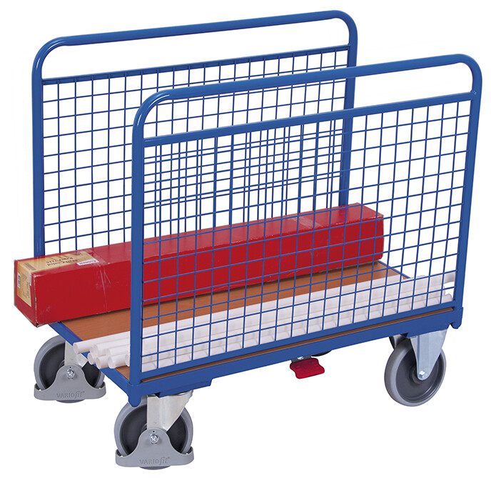 Budowa modułowa; konstrukcja podłogi z innowacyjnego profilu stalowego; powierzchnia użytkowa z płyty drewnopodobnej; okleina dekor bukowy; burty boczne z siatki, oczko siatki 50 x 50 mm; malowanie proszkowe farbą RAL 5010 (niebieski); wysoka odporność na uszkodzenia mechaniczne; bieżnik z szarej gumy termoplastycznej, niebrudzący, na feldze z tworzywa; koła z precyzyjnym łożyskiem kulkowym; osłona przeciwwłókienna i osłona stopy; 2 koła obrotowe i 2 koła stałe, z centralnym hamulcem EasySTOP (na długim boku, hamulec działa na 1 koło obrotowe i 1 koło stałe).