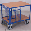 Budowa modułowa; konstrukcja podłogi z innowacyjnego profilu stalowego; powierzchnia użytkowa z płyty drewnopodobnej; okleina dekor bukowy; powierzchnia użytkowa bez krawędzi; malowanie proszkowe farbą RAL 5010 (niebieski); wysoka odporność na uszkodzenia mechaniczne; bieżnik z szarej gumy termoplastycznej, niebrudzący, na feldze z tworzywa; koła z precyzyjnym łożyskiem kulkowym; osłona przeciwwłókienna i osłona stopy; 2 koła obrotowe z centralnym hamulcem EasySTOP i 2 koła stałe.