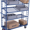 Budowa modułowa; konstrukcja podłogi z innowacyjnego profilu stalowego; powierzchnia użytkowa z siatki, oczko siatki 50 x 50 mm; ruchome półki zawieszane poziomo lub pod kątem na drabince co 120 mm; nachylenie przy zawieszeniu półki w pozycji ukośnej 15°; wysokość krawędzi półki 15 mm; przyspawany na stałe pałąk na jednym z boków wózka; 1 przykręcane ocynkowane rura spinające; malowanie proszkowe farbą RAL 5010 (niebieski); wysoka odporność na uszkodzenia mechaniczne; bieżnik z szarej gumy termoplastycznej, niebrudzący, na feldze z tworzywa; koła z precyzyjnym łożyskiem kulkowym; osłona przeciwwłókienna i osłona stopy; 2 koła obrotowe z hamulcem EasySTOP i 2 koła stałe.