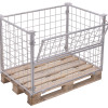 Składana konstrukcja stalowa; dopasowane do palet Euro oraz palet przemysłowych; piętrowane; brak możliwości przemieszczania w ułożeniu piętrowym; osiatkowane, oczko siatki 100 x 100 mm; 3 boki zamknięte, 1 bok do połowy otwierany; opcjonalnie z zawieszaną przegrodą; powierzchnia cynkowana ogniowo, nieużywane nadstawki można złożyć, oszczędzając miejsce magazynowe.