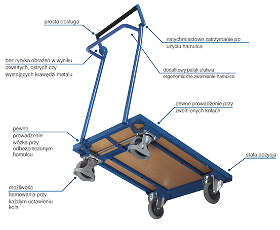 Hamulec postojowy VARIOfit® to kolejny system hamowania. Wykonanie jest typowe dla VARIOfit®: wysoka jakość, łatwość obsługi. Wózek skonstruowany jest tak, że przewód hamulcowy jest wbudowany w pałąk, a wszystkie części układu hamulcowego schowane są wewnątrz wózka. Tak więc nie ma żadnych wystających elementów, które mogłyby mieć wpływ na operatora urządzenia transportowego. Urządzenie transportowe jest zawsze zahamowane i zabezpieczone przed stoczeniem, do momentu zwolnienia uchwytu. Po użyciu hamulec postojowy zostanie automatycznie aktywowany, a wózek bezpiecznie się zatrzyma.